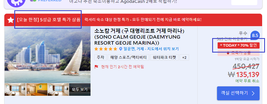 아고다의 경우 자체 할인된 상품들이 상당히 많다. 자신이 원하는 지역/ 호텔/ 날짜등을 검색하면 그와 관련된 정보는 물론 기타 할인되는 추가 정보도 알 수 있다. 그날그날마다 할인되는 상품들도 성급에 따라서 확인도 할 수 있어서 여행계획을 세우기에 합리적이기도 하다. 여기에 추가로 5% 할인적용까지 가능!