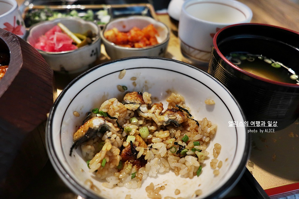 그리고 목기로 된 곳에 밥이 가득 들어있고 그 위에 양념된 장어가 올려져 있는데 한 마리가 들어간 터라 자세히 보면 구석구석까지 장어들이 들어있다. 냄새도 고소하게 맛있는데 비주얼도 아주 마음에 든다.