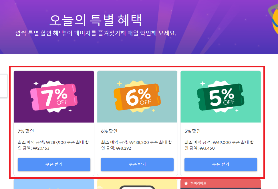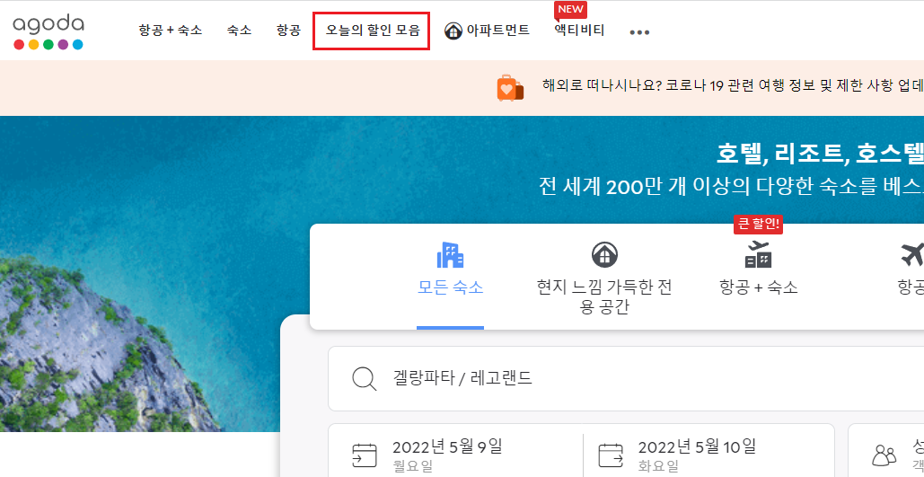 아고다 페이지(PC버전)에 들어가면 왼쪽 상단에 버튼들이 있다. 그 버튼 중에서 "오늘의 할인 모음"을 클릭하자. 이 페이지를 클릭하면 아고다에서 제공하는 공식 할인쿠폰을 그대로 다운받을 수 있다.
