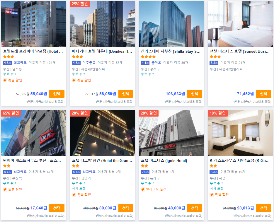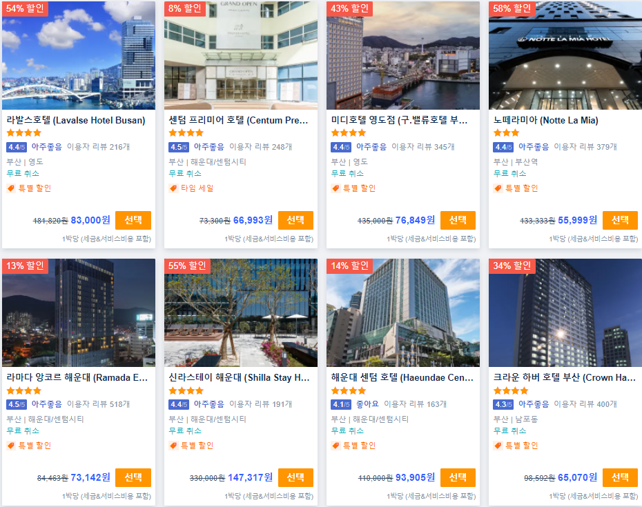 부산 경상지역의 약 30여 개의 호텔이 트립닷컴에서 세일 이벤트에 참여하고 있다. 특별한 노력을 들여 할인코드나 쿠폰을 찾지 않아도 자체 할인된 가격에 업데이트 되어있기 때문에 부산/경상 지역 호텔을 편리하게 예약할 수 있다.