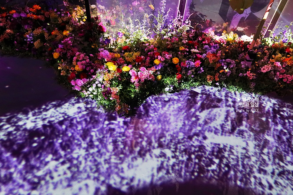 거대한 꽃에게 다가갈 때마다 배경이 바뀌었다. 물론 진한 향기를 내뿜기도 했다. 그래서 신기하고 재미있었다. 내가 다가갈 때마다 반응하는 꽃. 이 공간은 그걸 보여주고 싶었나 보다. 화려한 꽃들이 사람과 반응하는 것이 어떻게 미디어 아트로 재현될 수 있는가.. 말이다.