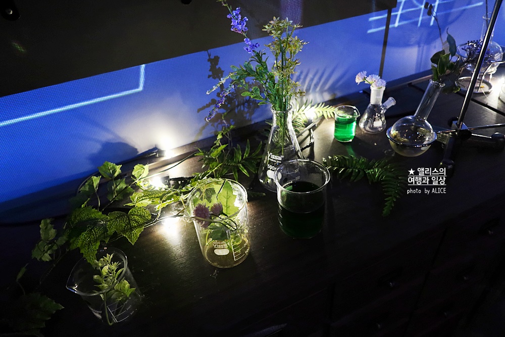 온갖 실험 도구가 가득했던 이곳에서 향기로움과 조화로움 그리고 화려함이 공존했다. 자세히 들여다보니 실험실 도구 하나하나가 다양한 색상으로 가득 차 있었다. 마치 이곳에서 꽃을 이용해서 다양한 물건을 만들어내는 일종의 아름다운 실험공간이 아닌가 싶었다. 물론 모두 소품이다. 그러니 누구나 만져봐도 무방하다. (물론 조심히 만져야겠지만)