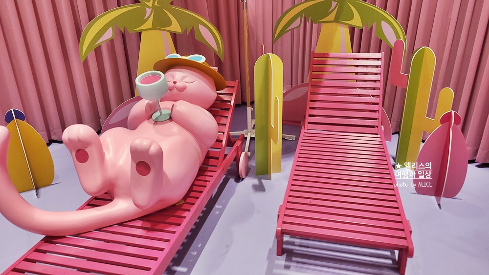 실제로 둘러보면 사진 찍고 싶은 생각이 마구 들게끔 세팅한 소품들이나 인테리어가 많았다. 특히 저 거대한 고양이는 누구나 사진을 찍는 대표 장소였다. 야놀자 팝업스토어 입장하는 입장 장소부터 남다른 느낌이었다. 분홍색 지하철의 한 장면 같기도 하다. 어딘가에 있을지도 모를 핑크 비치의 모습을 그대로 표현한 장소도 마찬가지로 인상적!