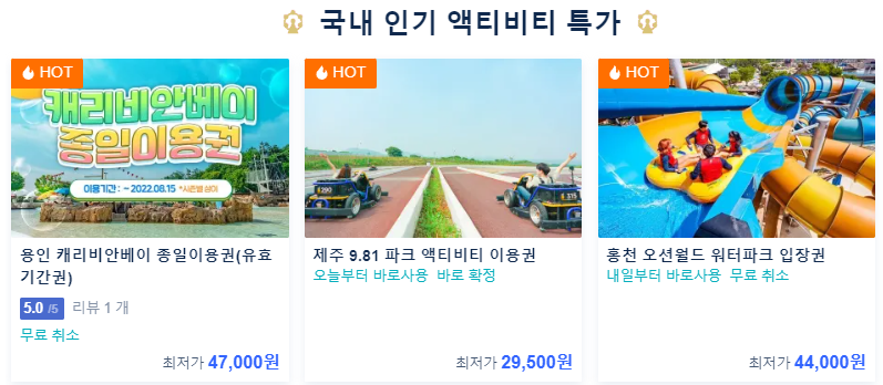 매주 목~일 한정으로 예약할 수 있는 국내외 인기 호텔, 항공, 액티비티 최대 50% 할인 이벤트다. 주말에만 오픈하니 지금 확인가능하다. 평소에 여행을 떠나고 싶어도 비용부담이 있었다면 이런 한정 오픈 이벤트를 잘 활용하는 것도 좋다. 상품을 돌아보다보면 예상치 못하게 원하는 날짜에 저렴한 항공/호텔/액티비티를 구매할 수도 있으니까!