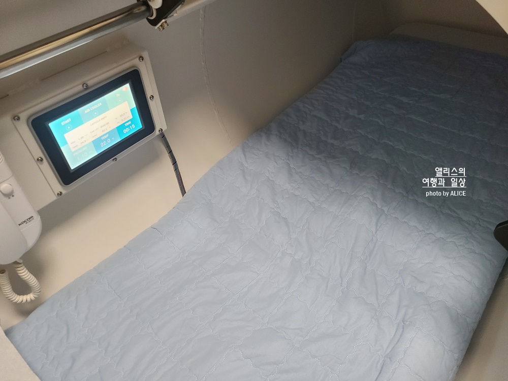 이 고압 산소 치료(HBOT)기 안에 들어가셔 편하게 한 숨 자면 자연스레 고압을 통해 산소가 내 몸에 들어가도록 하는데 귀의 압력 조절이 잘 안 되거나 폐쇄공포증이 있다면 이용하지 않는 것이 좋다. 나는 문제없기에 편하게 한 숨 꿀잠 자고 신선한 산소