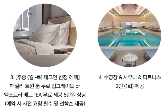 ① 주중(월~목 체크인 기준) 한정 선착순 디럭스→패밀리 트윈 룸 업그레이드 또는 엑스트라 베드 제공(사전 요청 필수)
