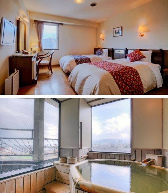 일부 객실에는 이불과 다다미 바닥이 있고, 천연 온천수를 사용하는 실내 및 실외 수영장이 있다.