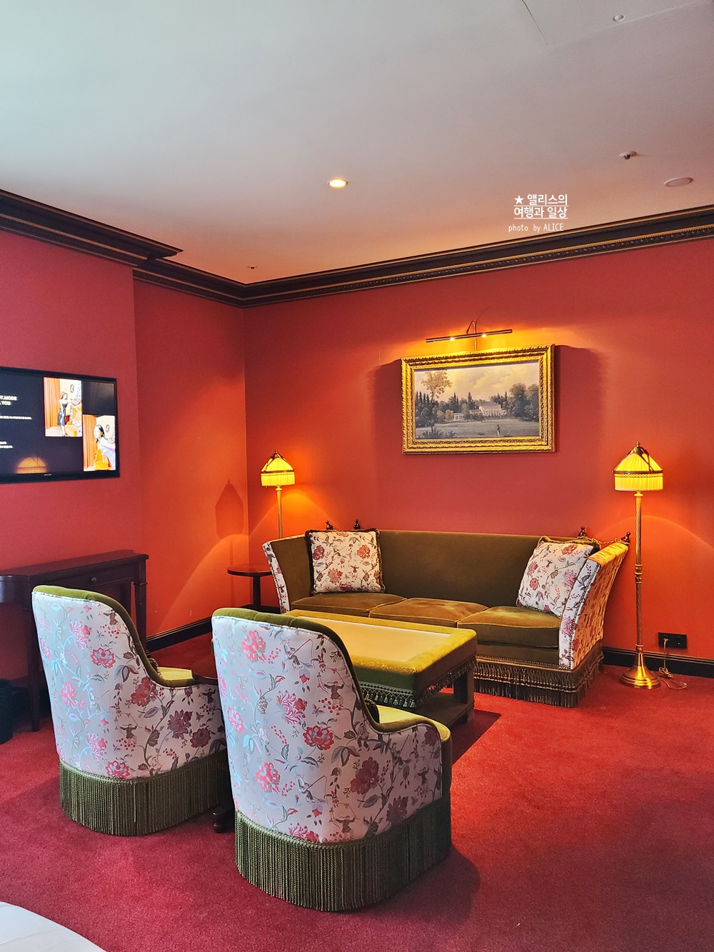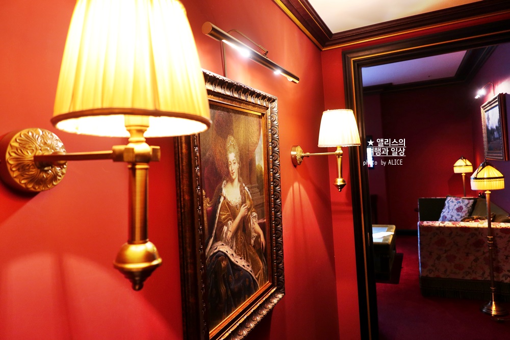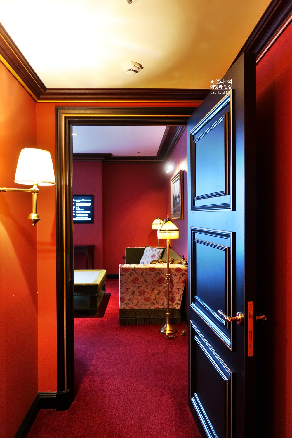 객실 입구에 들어서자마자 보이는 복도 공간 여기 그냥 두지 않았다. 왕실에 있을 것 같은 액자와 함께 앤틱 한 조명이 복도 공간을 밝힌다. 넉넉한 공간의 욕실에는 별도의 건식 형태의 욕조를 앤틱하게 이용할 수 있고 침실의 화려한 캐노피는 마치 내가 유럽의 한 고성에 온 것은 아닌가 싶은 느낌을 주기도 한다. 소파에 앉아 충분히 즐거운 차담시간을 보내기도 할 수 있어서 무척 좋다.