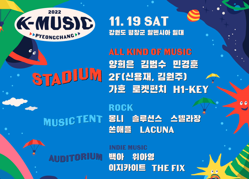 장르는 다양하게 남녀노소 즐거운 이벤트로 다시 돌아온 2022 K-뮤직을 통해 쌀쌀한 가을 뜨거운 열기를 느끼며 강원도 평창 여행을 즐길 수 있지 않을까 싶다. 2022 K-뮤직 관련 정보는 아래 정리해두었으니 참고하시길~