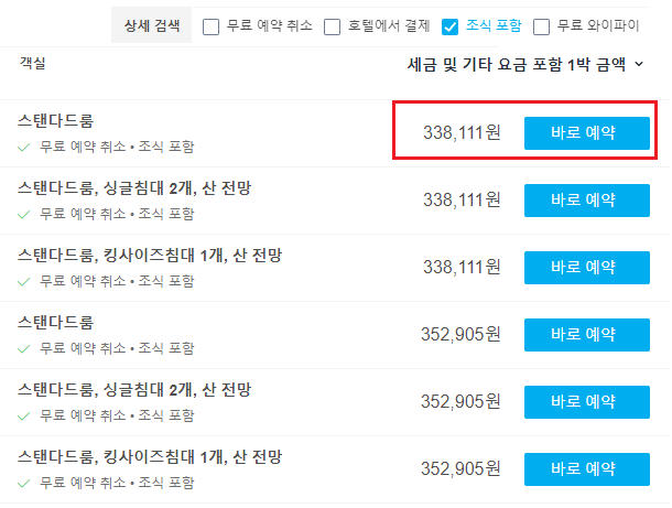조식 2인 포함 + 무료예약 취소 조건도 동일하다.