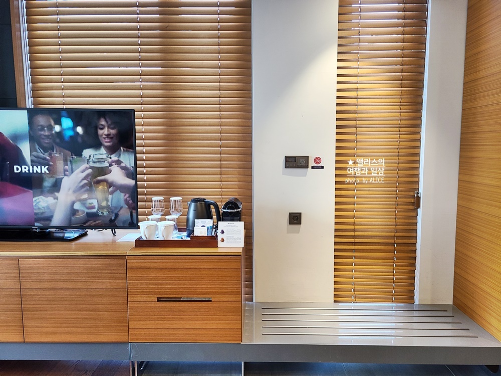 옷장도 충분히 수납력이 있었고 별도의 짐가방을 둘 수 있는 거치공간이 있어서 개인적으로 내 짐을 모두 풀어도 불편한 점은 없었다. 특히 별도로 요청하지 않아도 기본으로 준비된 다리미와 다림질판도 마음에 들었다. 하지만 아쉬운 점은 냉장고에 유료음료가 가득 차 있다는 점이 살짝 아쉽.
