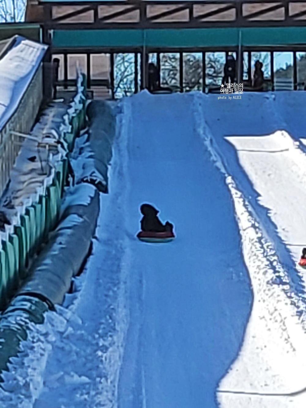 어릴때나 타보고 그 간 타보지 못했던 눈썰매. 어른 전용 슬로프에서 눈썰매 타니 이게 엄청 재미났다. 날씨는 엄청 추워서 콧물이 그렁그렁해도 스피디하게 내려가는 눈썰매에 안전하게 착지가 가능한 시설 덕분에 정말 재미있었다. 그래서 계속 올라가서 눈썰매 타고 했을 정도!