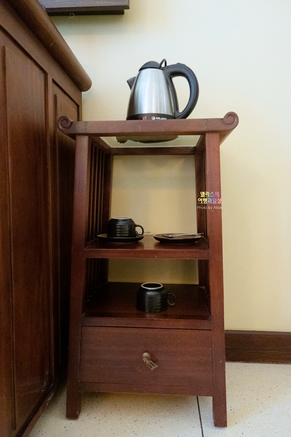바로 옆에 별도의 수납장에 준비된 전기주전자와 티컵