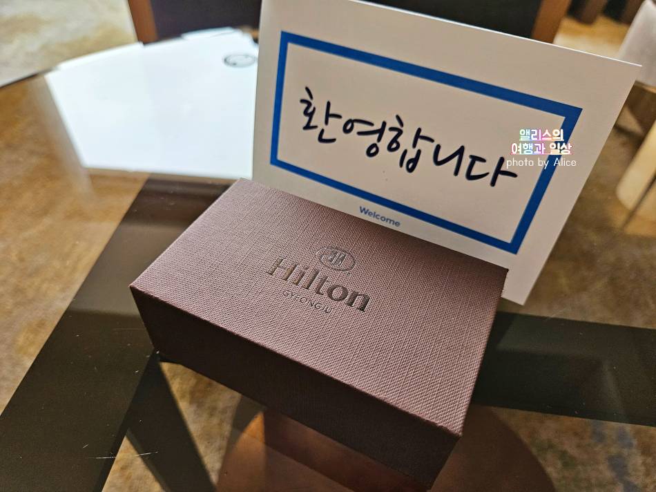 첫 시작은 경주 힐튼. 당시 임시로 부여받은 골드 등급으로 경주 힐튼을 체크인했는데 운이 좋았던 터라 금요일 체크인이었고 프리미엄 킹 룸을 예약했는데 "주니어 메이플 스위트룸"으로 무료 업그레이드를 받았다. 1박당 20만 원의 차액만큼 무료 업그레이드가 된 셈. 골드등급임에도 무료업그레이드가 된 것을 보면 운이 좋았던 것 같다. 객실에는 웰컴 초콜릿도 있었다.