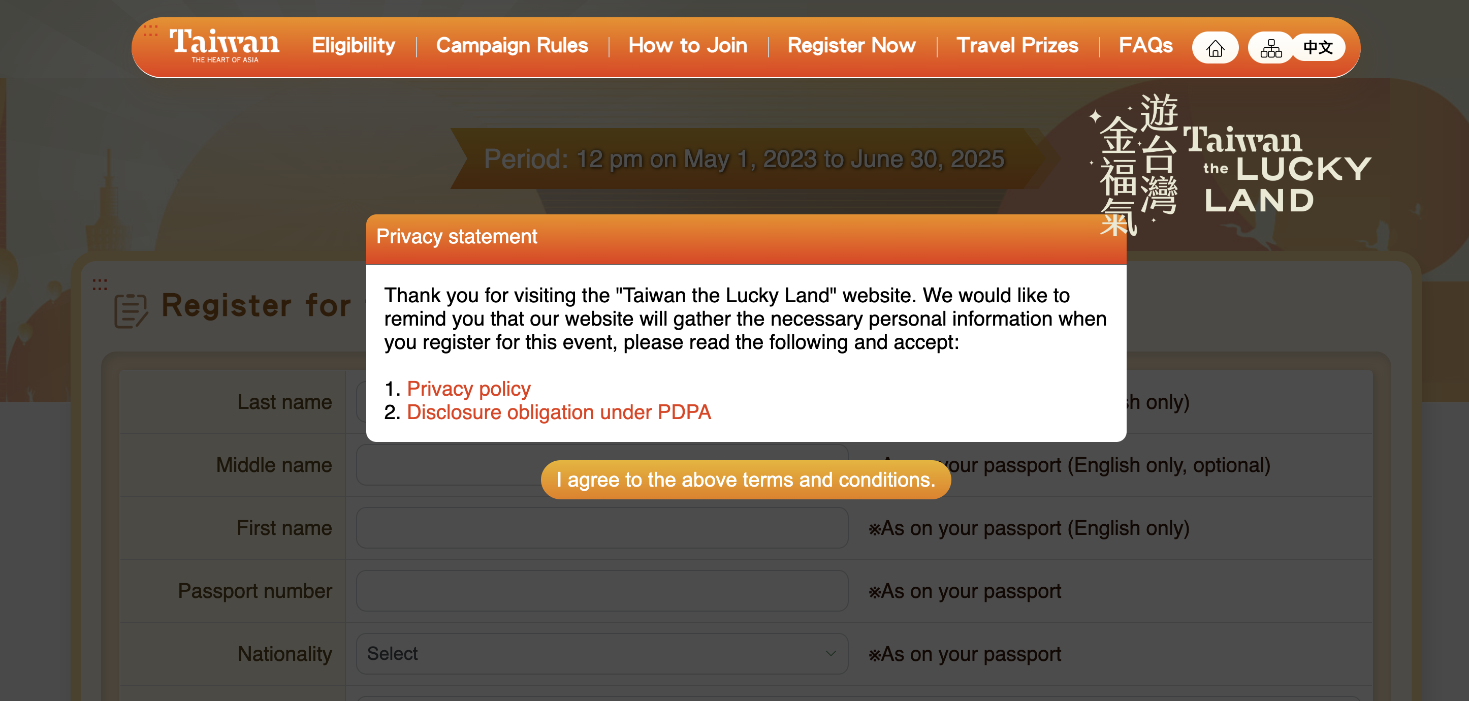 다음주에 대만여행이 계획되어 있다. 그래서 여러 대만 여행 상품을 구매하고 스케줄을 조정하는 중에 알게 된 대만관광청 지원금 이벤트! 장여행객이라면 누구나 제한 없이 지원가능하며 간단한 조건(체류기간등)에 적합하기만 하면 신청하는 데 전혀 제약이 없다. 그래서 내가 바로 신청해 봤는데 무려 TWD 5,000(= 약 245,750원)을 받을 수 있는 최종 등록이 완료되었다. 방법도 간단하고 마침 대만여행을 할 예정이었던 터라 나에게는 완벽한 기회! 간략하게 정리해 보고 아래 방법대로 따라 해보시고 기분 좋은 대만 여행 준비하시길 추천!