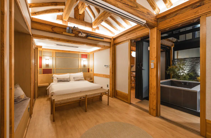 도심에서 만나는 한옥이라는 컨섭에 매우 충실한 한옥독채로 욕실내 음성제어 시스템으로 조명, 음악등 조절가능한 자쿠지는 물론 입욕소금까지 완벽하게 준비되어 있다.