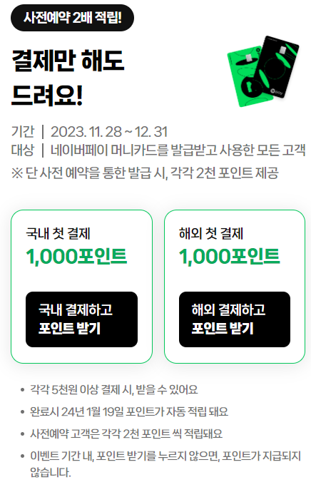 이벤트 기간(2023.11.28.~2023.12.31.) 중 네이버페이 머니카드로 국내/해외 각각 5천원 이상 사용해야 포인트를 지급받을 수 있다. 5천원 이상 결제 후 포인트 받기 버튼이 활성화 되며, 이때 반드시 버튼을 눌러야 포인트를 지급받을 수 있다. 버튼 누르는 것을 잊지 말자.
