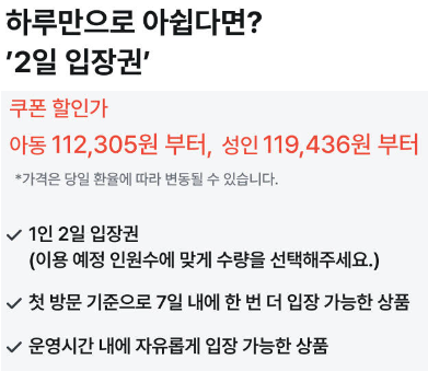 다소 높은 입장료인 LA유니버셜 스튜디오 할리우드 입장권을 보다 저렴하게 이용할 수 있는 특가 프로모션이다. 할인쿠폰은 당장 적용되지 않지만 그것과 별개로 할인된 가격으로 등록되어있으니 다른 곳과 비교해서 이용원하는 날짜 입장권이 저렴하다면 이용해보자.