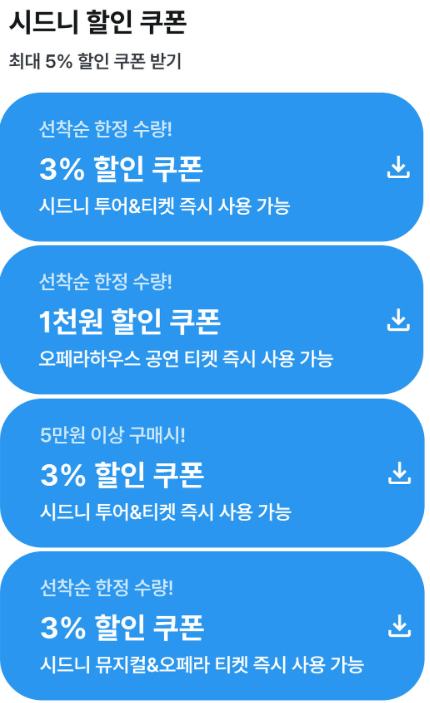 - 할인쿠폰: 3% 할인쿠폰(최소 결제 조건 없음), 3% 할인쿠폰(5만원 이상 구매시), 시드니 뮤지컬&오페라 3% 또는 1천원 할인쿠폰