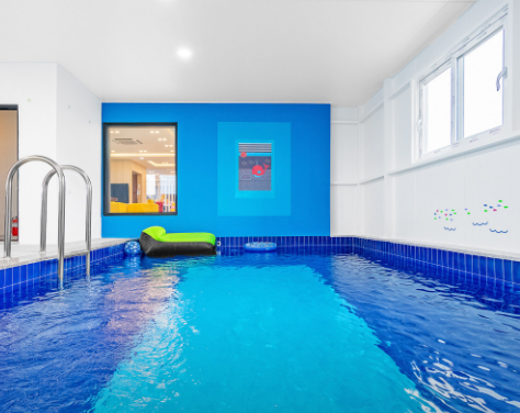 개별수영장에는 실내온수풀(4X12M),미끄럼틀, 수심 120cm의 수영장으로 남녀노소 모두 수영하기 좋다.