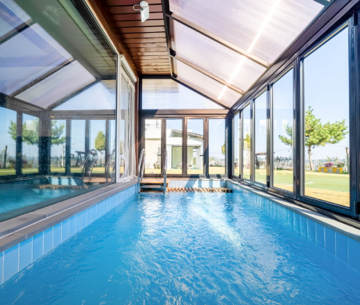 야외수영장은 개폐형 천장으로 손쉽게 열고 닫을 수 있어 추운 겨울에도 이용할 수 있다.