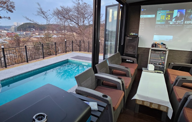 빔프로젝터, 노래방기계 완비되어있어 즐거운 시간을 보낼 수 있다. 테라스에 있는 화목난로에서 불멍이 가능하고, 하절기에는 야외수영장을 운영하고 있다.