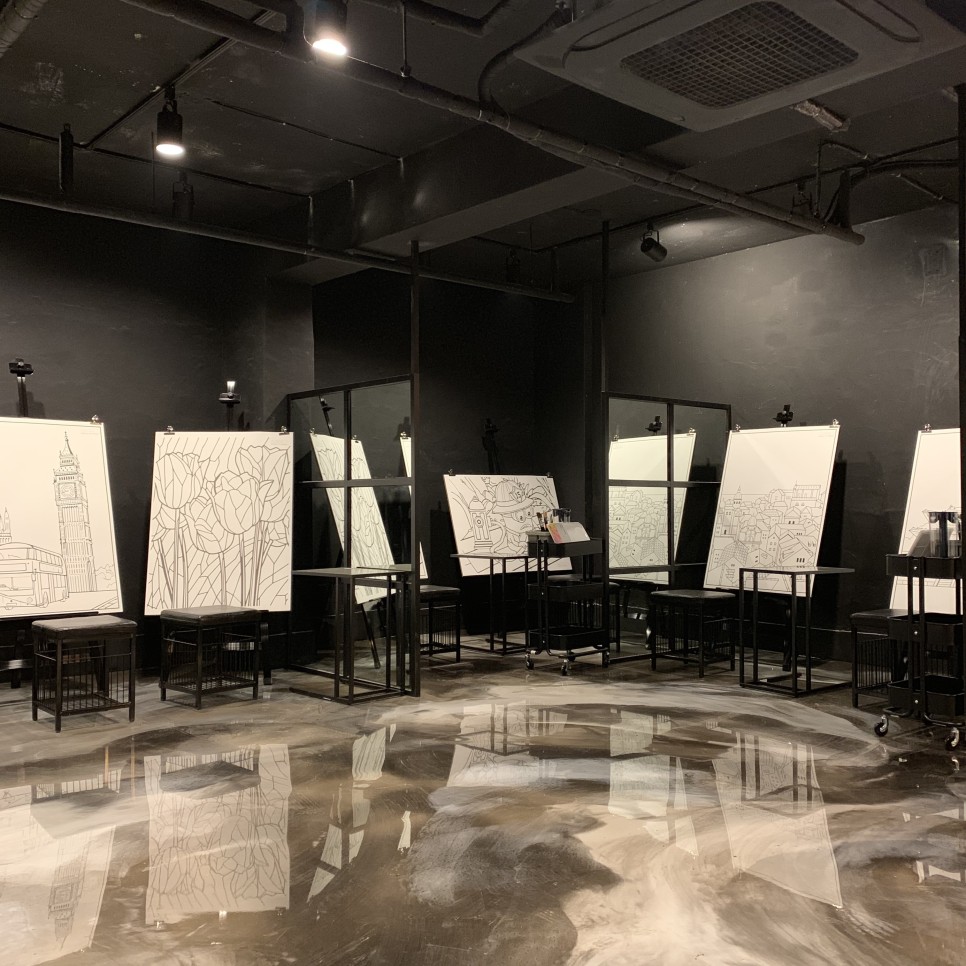 커플,친구,부모님과 아이 등 다양한 연령대가 즐기기 좋은 홍대놀거리가 파티션으로 공간 분리가 잘 되어 있는 편이라서 최소 2인부터 최대 6인까지 한 공간 안에서 그릴 수 있고 혼자 와서도 체험하기 좋다.