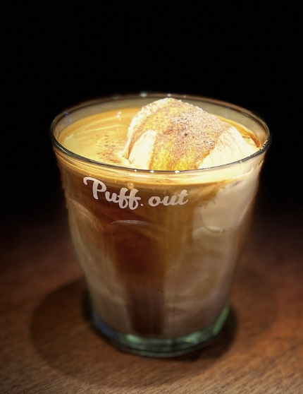 금색과 블랙의 외관으로 시선을 붙잡는 퍼프아웃은 입구의 크리스탈이 동굴에 들어가는 느낌을 주는 독특한 공간이다. 한쪽벽면을 가득채운 디스플레이와 바테이블, 우디한 인테리어와 스피커를 모티브로 삼은 크리스탈장식이 강렬한 인상을 준다.