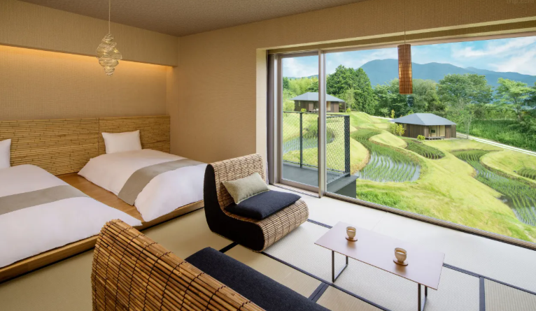 : 다다미방+침대 조합, 대형 창문으로 자연 전망 감상할 수 있다. 유명 공예가의 조명, 대나무 세공 등 세련된 인테리어가 인상적이다.